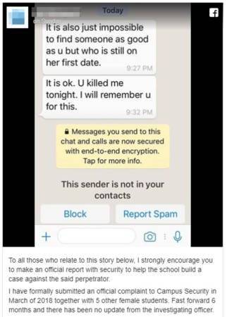 国大女生声称,硕士生发给她的第一通Whatsapp,就吹嘘自己“性经验丰富,会是一名好男友”。她事后跟对方见面,要当面表明不想跟他有任何瓜葛的意愿,没想到对方初见面时就索吻,令女生饱受困扰,向校方投诉。
