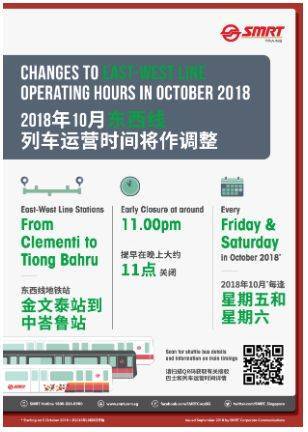 由于SMRT的工程团队将对东西线的部分轨道进行新信号系统维护和更新工作,2018年10月,从中峇鲁(Tiong Bahru)到金文泰(Clementi)之间的7个地铁站将会在接下来的每个星期五和星期六提前到晚上11点关闭。
