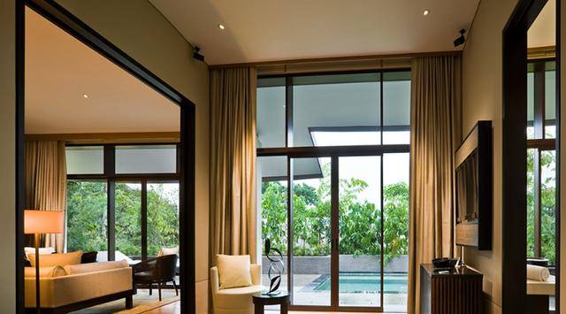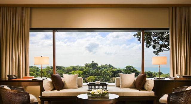 在每一个现代亚洲风格装饰的房间中,都有开阔的窗景欣赏到雨林花园景观或是中国南海美景。