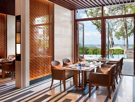 抬眼望去,酒店的三座叠水泳池在茂密的树林中尽收眼底,稍远些还可看到南中国海的壮丽风光,如此亲近自然的早餐开启元气满满的一天。