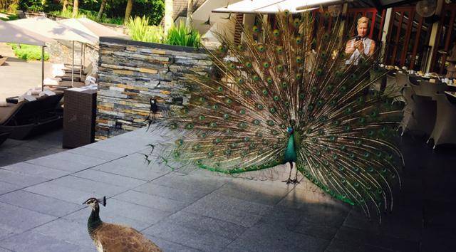 清晨于满眼青葱碧绿中醒来,前往酒店的地中海餐厅The Knolls同孔雀们共享一顿惬意的早餐。雄孔雀时不时开屏抖动自己美丽的羽毛向雌孔雀示爱。