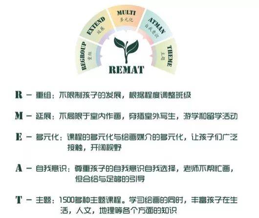 Tree Art拥有自主研发的REMAT课程体系。Tree Art课程体系依据螺旋式上升教学原理(Spiral Curriculum),美国著名教育家、心理学家布鲁纳(J.S.Brune r)提出。依据学生的年龄、生理和心理特征,针对式设置专业课程与班级,适合2至18岁的孩子长期学习。