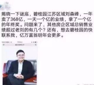 如果销售额一百多亿的区域总都能够拿到1个亿的年终奖,那么江苏区域的刘森峰能拿到的应该是2字开头的,因为其所在区域还跟投了1.5亿元,其个人把房子抵押了,把钱砸进去。
