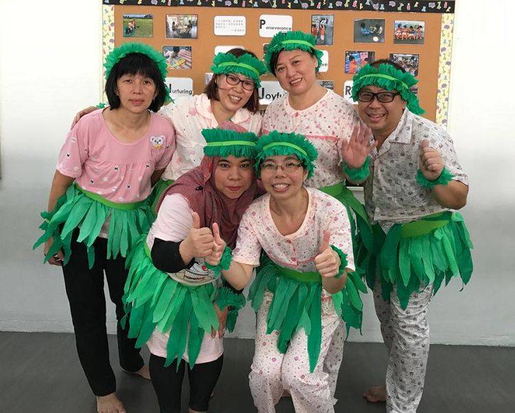 老师们还穿上纸制的草裙,画风诙谐。让人脑海中不禁飘过洗脑神曲,像一棵海草,海草,随波飘摇,海草,海草,浪花里舞蹈……..