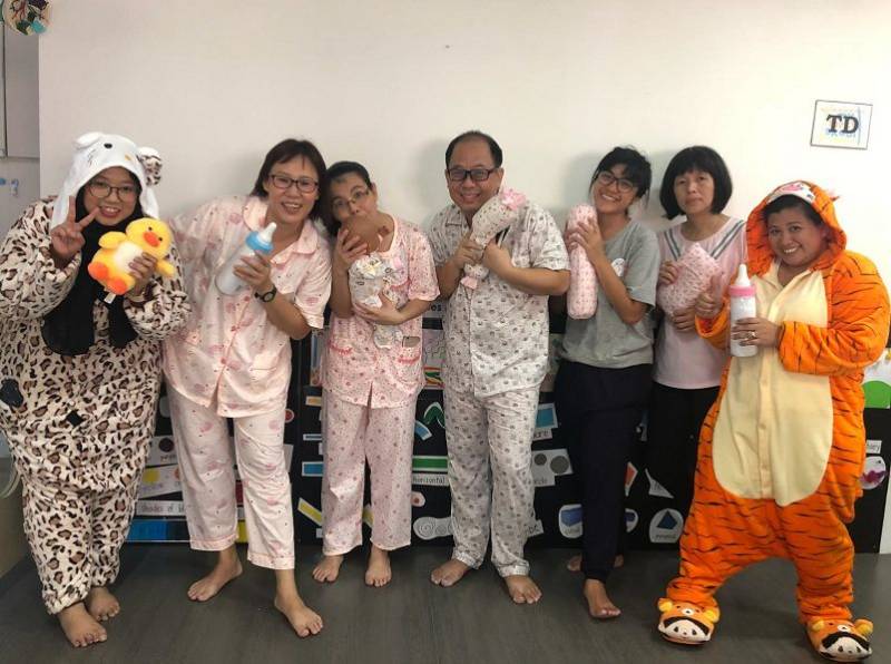 有的老师还穿上了萌萌哒连体睡衣~ 大家拿着奶瓶、抱枕,也是很可爱了~