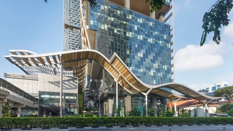 双景坊是马来西亚首相和新加坡总理联合支持,并具有历史意义的项目。网状的六角形遮阳系统形成天然的外皮附于凹进的外形上,动感十足,部分幕墙形状修长,飞扬延伸至附属的道路。镶嵌在塔楼中间的广场融合了多个花园和园景休闲区。