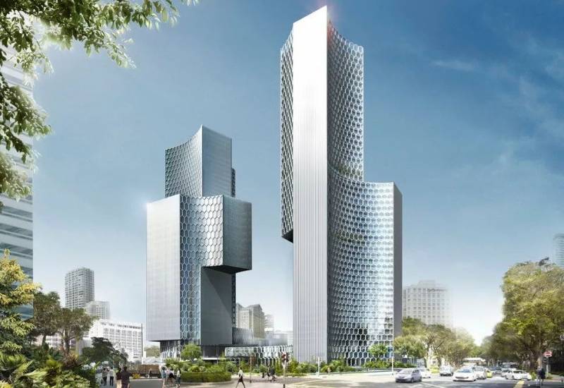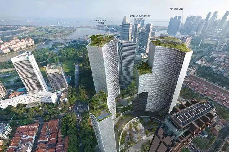 DUO双景坊由马来西亚和新加坡政府联合开发,极富历史意义。由著名建筑师Ole Scheeren设计的双子楼高度分别是186米和170米,一座为660套的商业公寓,另一座为办公楼和Andaz五星级酒店。塔楼与地面相接之间,建筑的功能逐渐模糊,变成一个开放的通透公共空间。