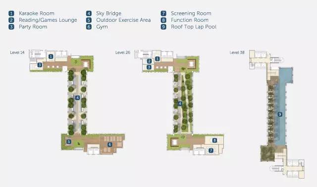 三条各具特色横跨建筑间的晴空绿桥是这次介绍的重点。分别在14楼,26楼和38楼。14和26楼为休闲空间,38楼为泳池。