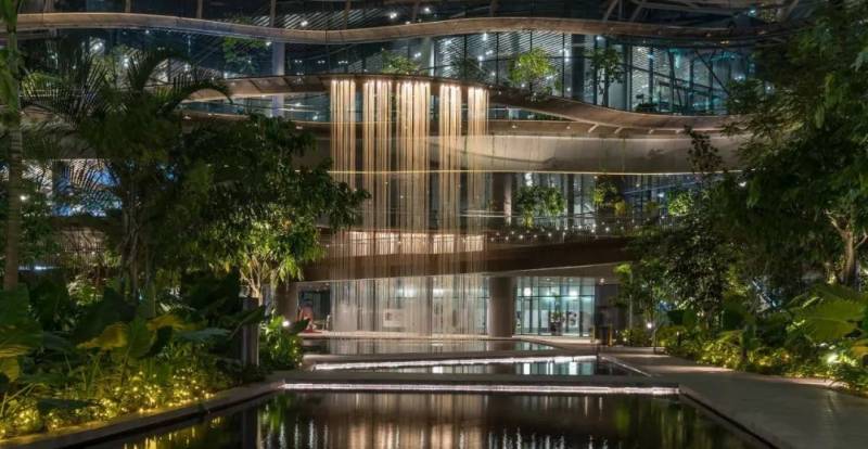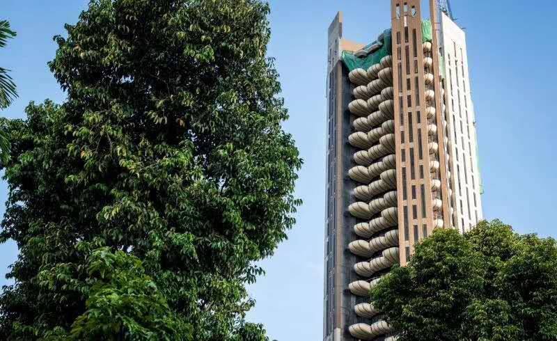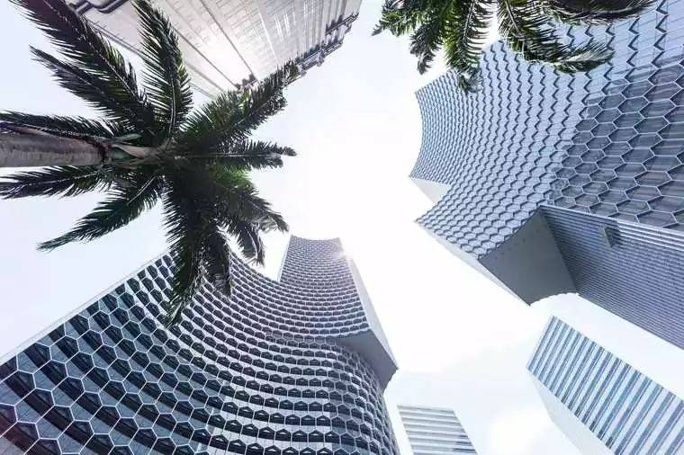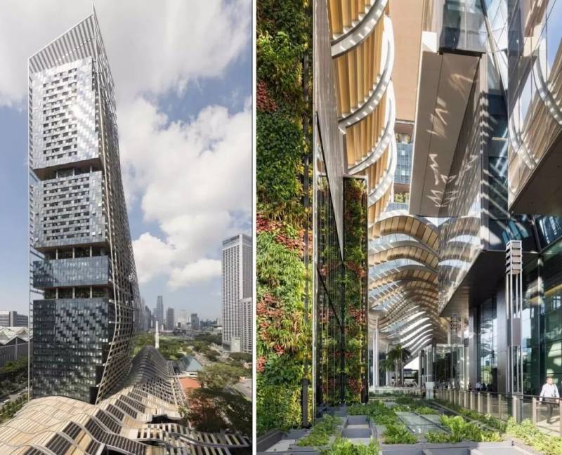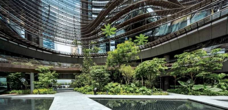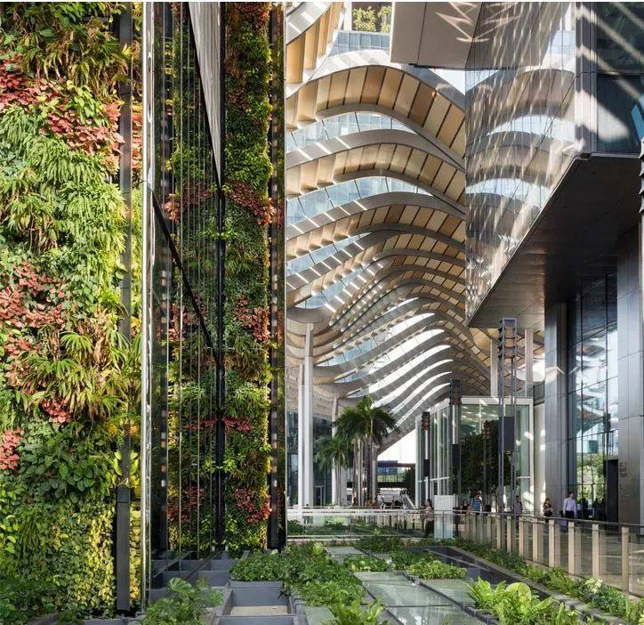 建筑本身就如一座布满了绿植的大山,四幢高楼大厦围绕着建筑物中间的中心花园,是这个设计另一个特殊点。设计受到亚洲梯田的启发,四座塔楼围合一个绿色中心“绿色心脏”,由德国著名建筑设计公司克里斯多夫完成。