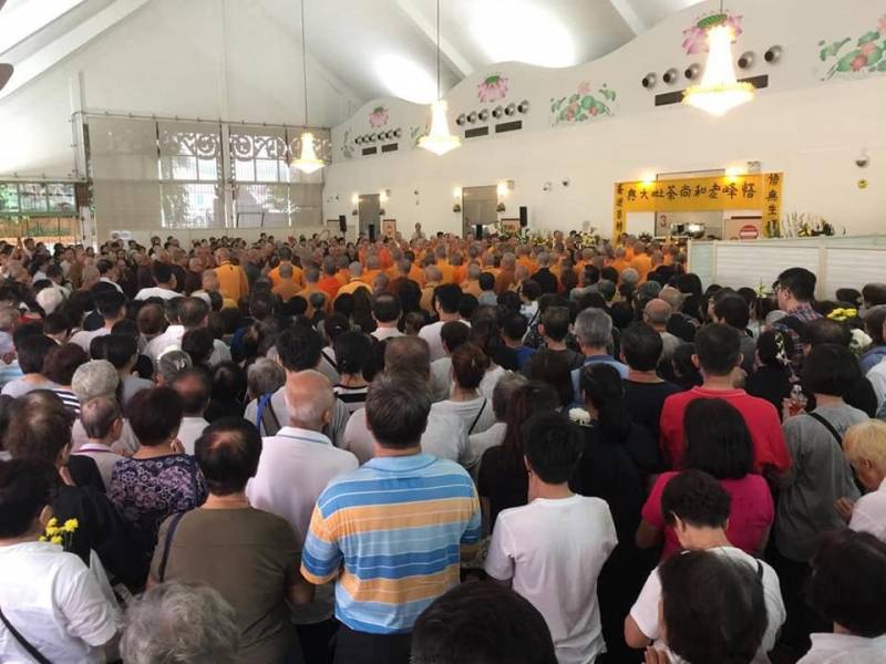大批僧侣诵经祭拜,佛教总会会长广品法师等僧侣纷纷出席。悟峰长老的出殡仪式早上9半在观音亭举行,中午时分移灵光明山火化。上午的举棺仪式由世界佛教僧伽会副会长日恒大和尚主持。大批信众也到观音亭为悟峰长老送殡。
