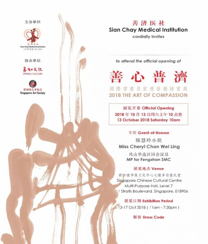 10月13日(周六)上午10点,由善济医社主办,真如文化和新加坡艺术协会协办的《善心普济 · 国际书画名家慈善邀请赏展》开幕式将在新加坡华族文化中心七楼多功能礼堂举行。入场免费,欢迎大家和自己的亲朋好友共同品味这艺术大餐,并参与到此次的爱心活动中来。感恩,祝福!