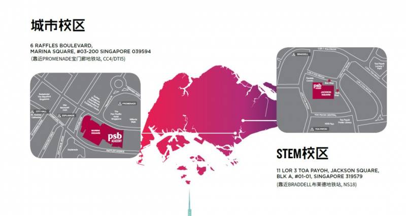 PSB学院在新加坡拥有两个校区,分别是位于滨海湾广场的城市校区和位于新加坡中心的STEM校区。