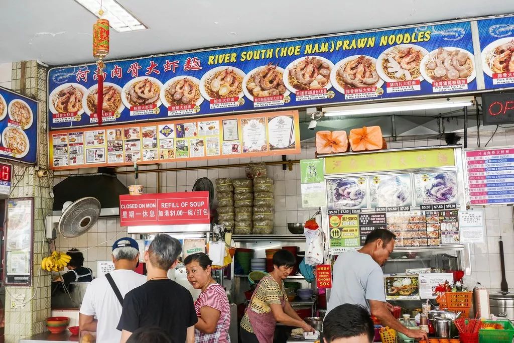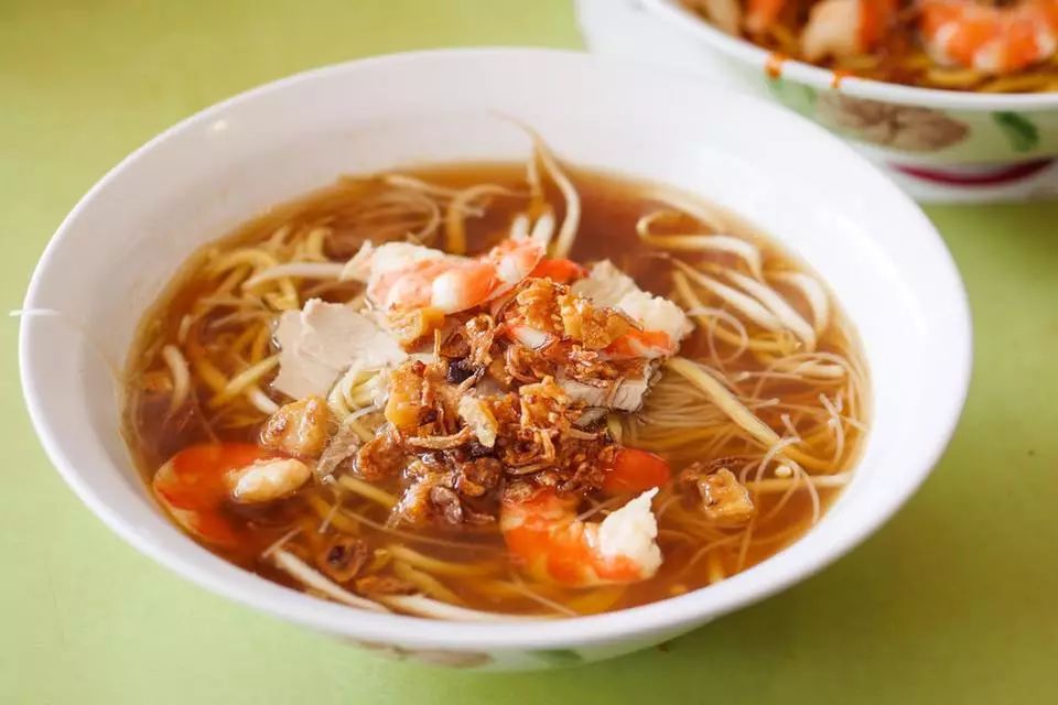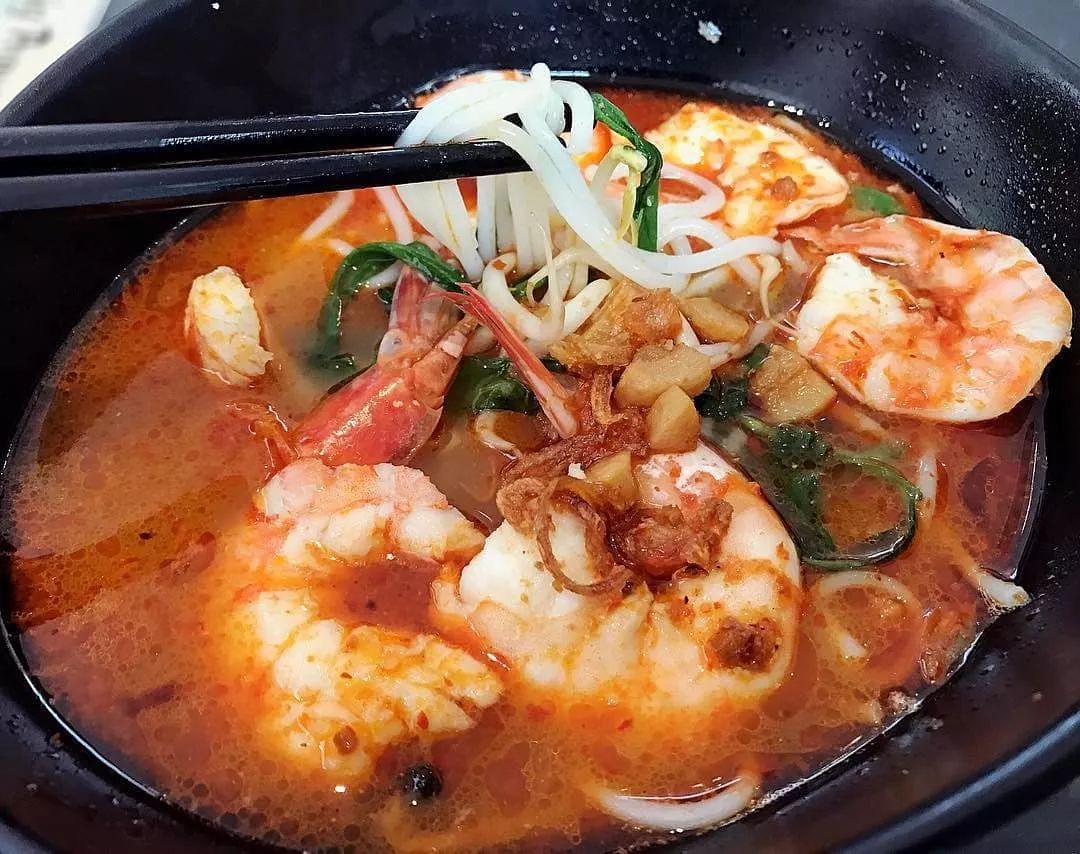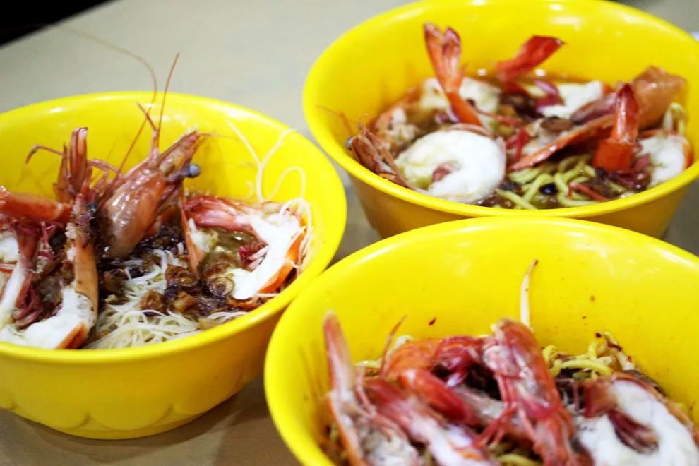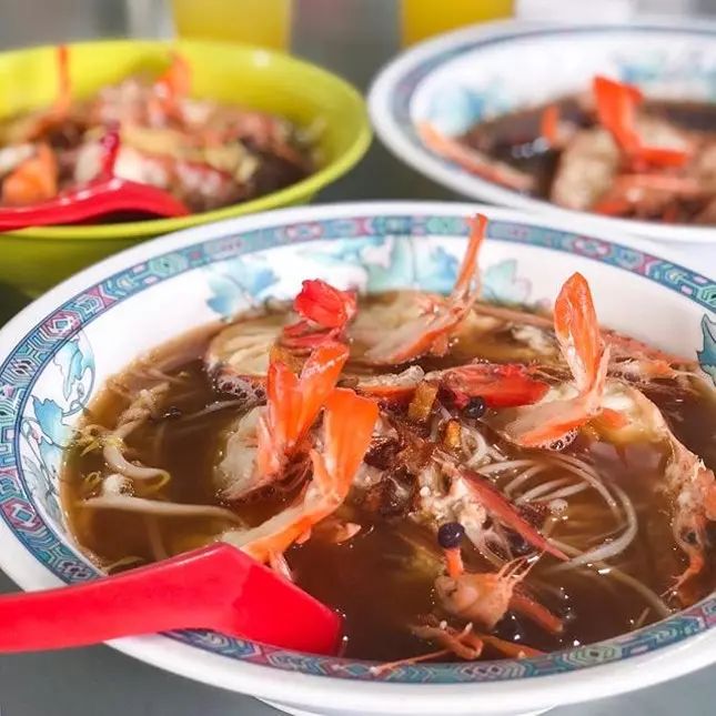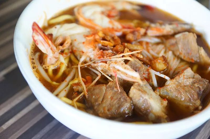 大虾面Prawn Mee分成带汤和干捞两种:汤底是浓浓的肉汤配上虾头一起炖,不仅有虾的鲜味还有肉的浓郁香气。面条有弹性汤,排骨是常见的配料,喜欢吃辣的人在上面撒上一层厚厚的辣椒粉。