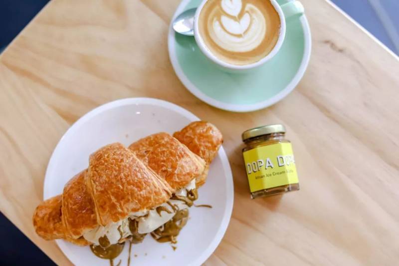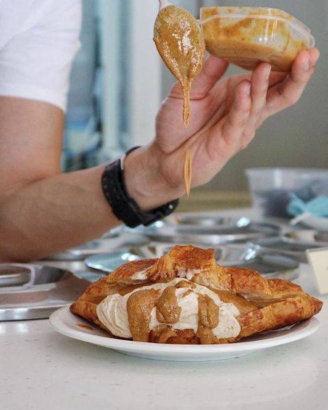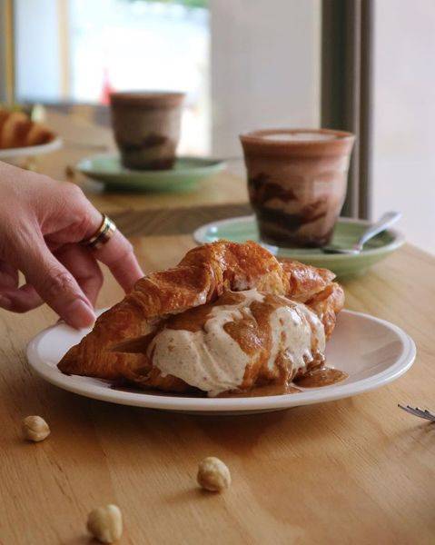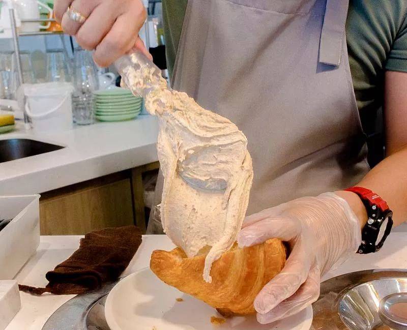 店家最推荐的吃法是可颂里夹上开心果冰淇淋,然后淋上一勺自制的榛子酱,入口都是浓郁的果仁气息。