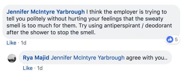 有网友更是不客气,说也许是发帖人的汗臭味让雇主无法忍受….