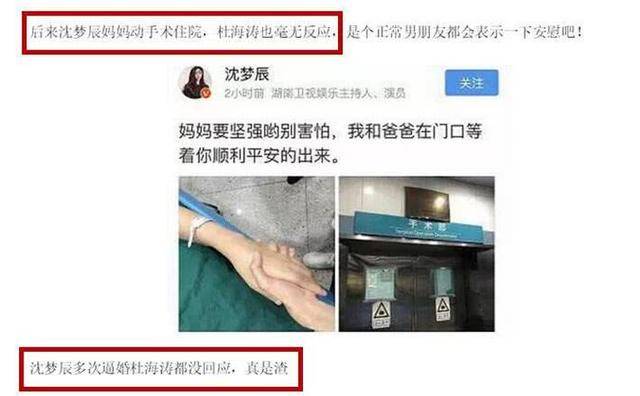 其实所谓的分手传言也是来源自最近几天,沈梦辰的母亲生病住院,但是杜海涛却毫无反应,结果女方就在个人的社交平台上发文称,我可以很坚强引发了舆论热议。