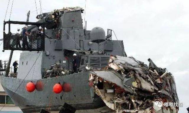 2003年,一艘新加坡水兵的反潜舰不慎和一艘荷兰货轮发生碰撞,由于体量相差过大,该军舰被撞的惨不忍睹,面目全非。
