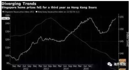 2011年~2016年香港和新加坡房价指数,新加坡房价连续3年下跌