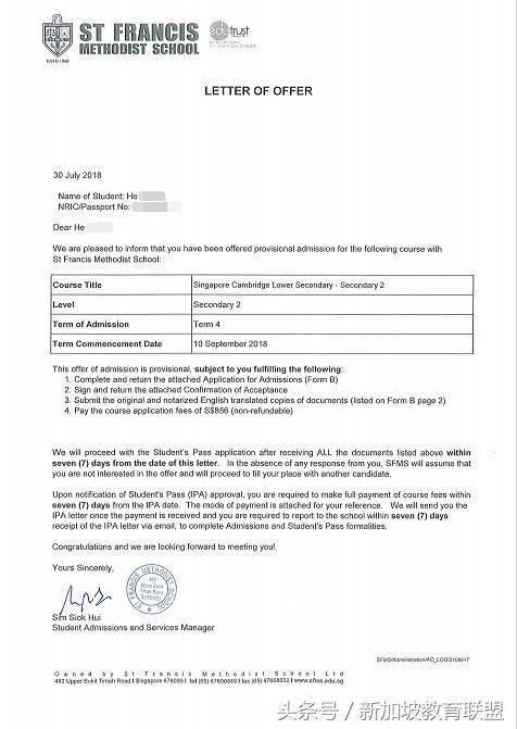 新加坡圣法兰西斯卫理公会教会学校OFFER展示