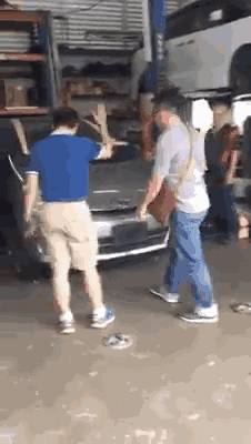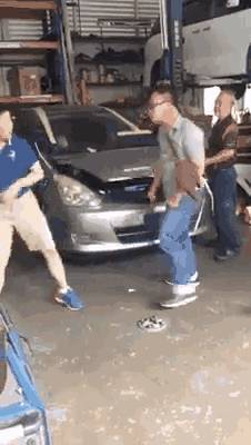 时长2分15秒的视频,可看到身穿灰色上衣的男子在一辆打开了引擎盖的丰田休旅车前,在一旁撑著引擎盖、身穿蓝衣的老板,突然放手让引擎盖合上,灰衣男发怒推开老板,老板则不断挥舞手上的铁锤。其间,老板一直尝试阻止男子拉车,男子则多次用身体和手臂推撞他,老板恼羞成怒挥铁锤逼退对方,男子不甘示弱出言挑衅,连说10多次“来啦!来!”,并用胸口撞向老板,但双方始终没有动手。
