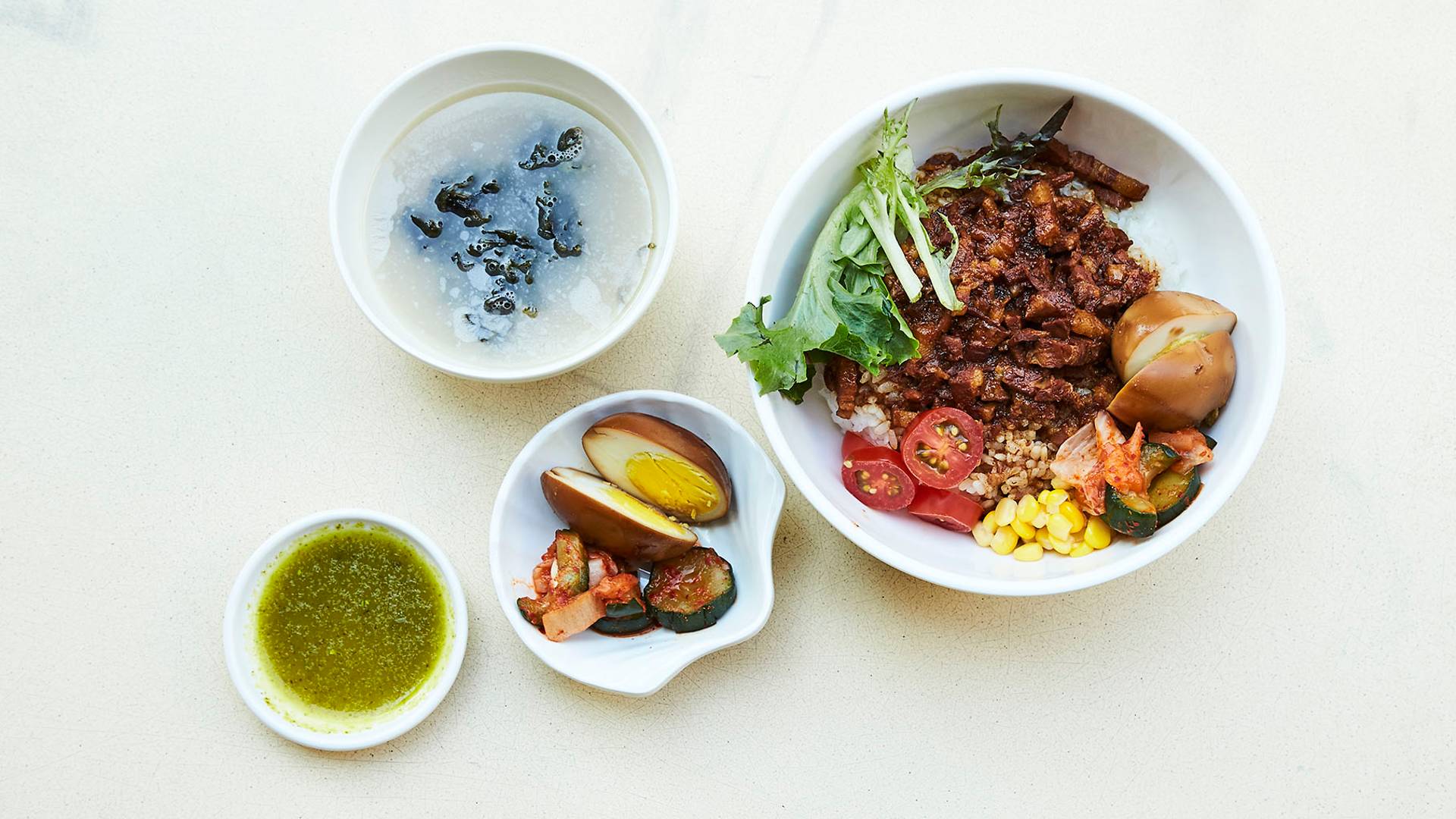 档口售卖八款不同的组合套餐,其中就有味增卤肉饭、软壳蟹卤肉贩、百香果酸甜肉、青椒酱香茅鸡排等等,融合不同料理元素的台湾菜色。