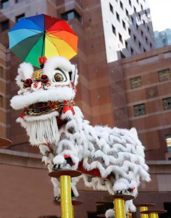 除了喝奶之外,谭国安还看到一只醒狮在高桩上撑起雨伞舞动,另一只则当场戴上眼镜。