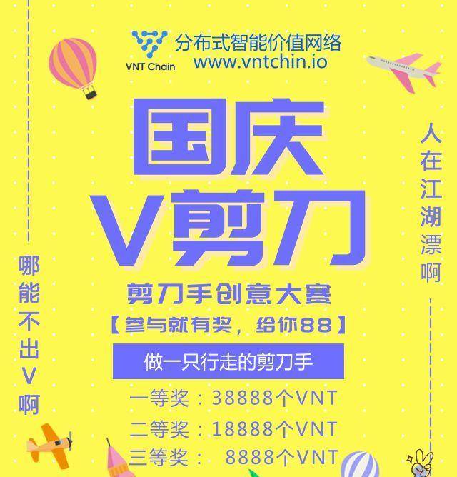 1.9月29日,国庆剪刀手创意大赛正式开启!金V奖38888VNT等你来拿!参与方式:发送剪刀手创意照片至公众号后台。目前海选环节已截止,获奖名单敬请期待!