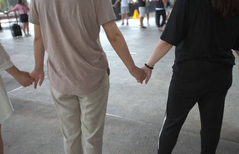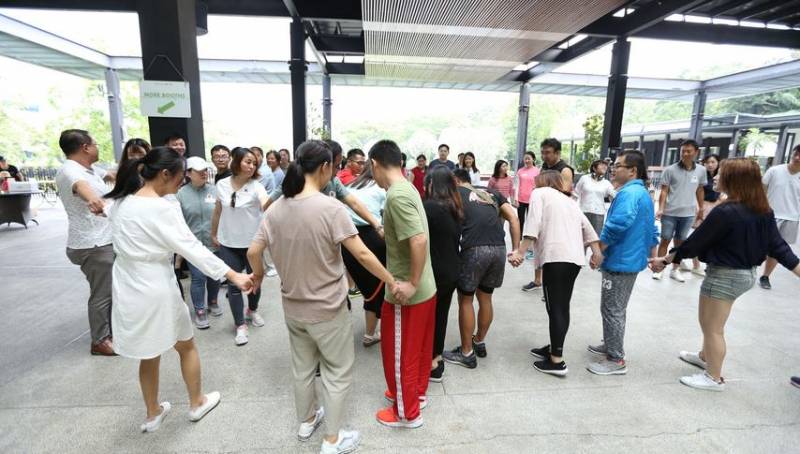 熟络之后,主持人给大家出了一个难题,让大家手拉手,从一个呼啦圈里穿出来~