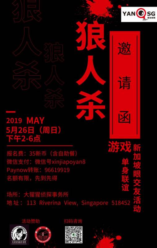 新加坡眼会不定期举行线下单身联谊活动,本周日是刺激的“狼人杀”游戏,名额有限,先到先得,详情请加微信 xinjiapoyan8 咨询。