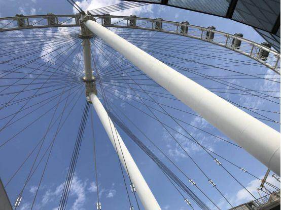拍照留念之后我们来到新加坡摩天观景轮,新加坡摩天观景轮又名飞行者摩天轮(英语:Singapore Flyer)是一个位于新加坡的巨型摩天轮。摩天轮的设计由奥雅纳和三菱重工承担。高165米相当于42层楼高,比英国伦敦的“千禧眼”还要高30米。坐在这个“幸福摩天轮”里可把新加坡风光明媚的滨海湾、高耸的摩天大楼37分钟之内尽收眼底,甚至马来西亚及印度尼西亚部分岛屿的大好风光亦可收入眼帘。