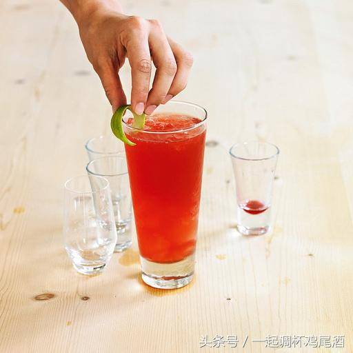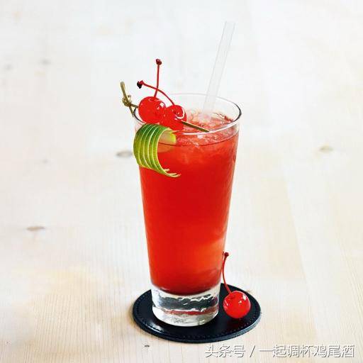 用苏打水加至九分满,并用樱桃、柠檬皮条装饰