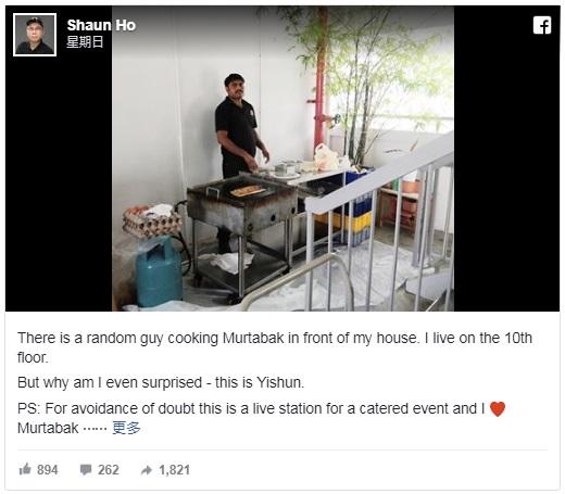 义顺一座组屋的居民Shaun Ho星期天(7日)在Facebook上发文:“有一名男子在我家前面煮印度馅料煎饼,而我居住在10楼。可是这有什么令人感到奇怪的,毕竟我居住在义顺。”