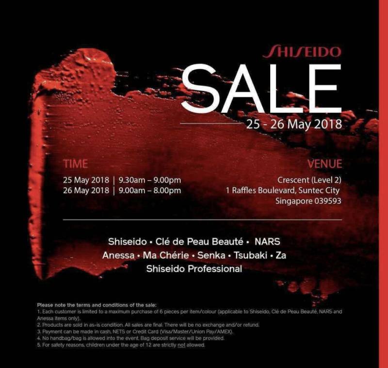 Shiseido, Cle de Peau Beaute, NARS, Anessa, Laura Mercier, Ma Cherie, Senka, Tsubaki, Za and Shiseido Professional 等各种美妆产品大甩卖!快去抢购吧~