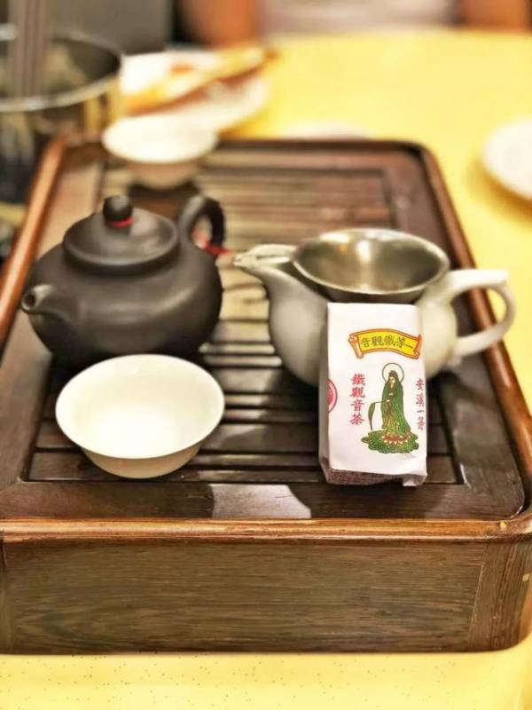 肉骨茶的肉汤浓郁,所以一般会搭配茶解腻。看菜单上有一个“功夫茶”的选项,就要了一泡铁观音。不一会儿老板就端上来一个功夫茶盘,盘里放着茶壶、茶杯和一包古朴的铁观音纸包茶。