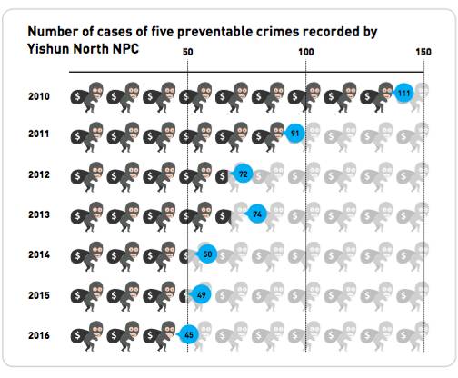 义顺市镇理事会在官网上分享统计局的数据,显示义顺北邻里警署接获的可预防罪案从2010年至2016年有下降的趋势,从2010年的111起下降至2016年的45起,下降超过一半。非法放贷等相关骚扰案也下降55%。