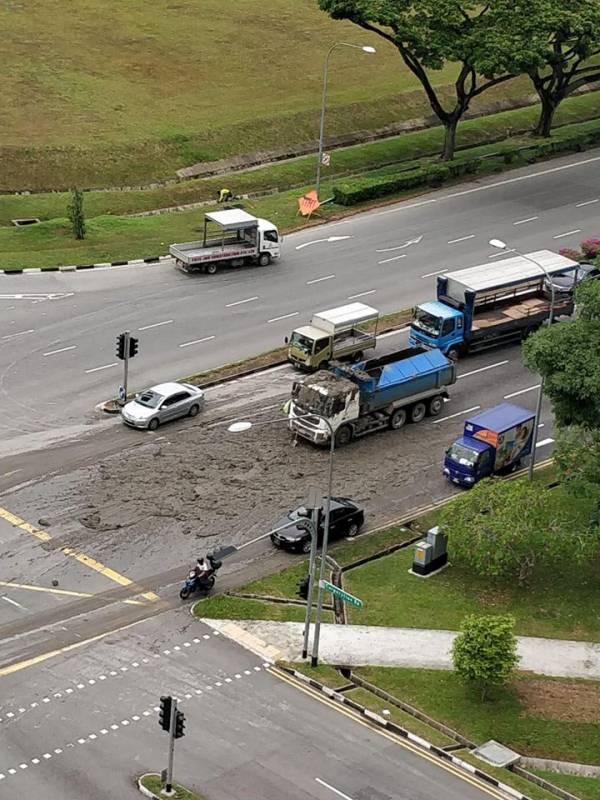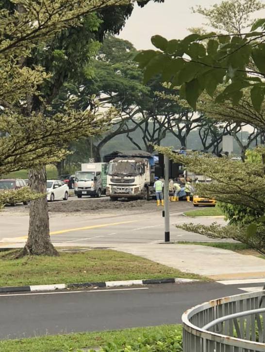 公路变泥滩?有网民下午在裕廊西2道拍到照片,显示一辆运泥车疑似发生泄漏,导致灰黑色的泥浆洒满公路,影响交通。目击者表示现场“一片混乱”。