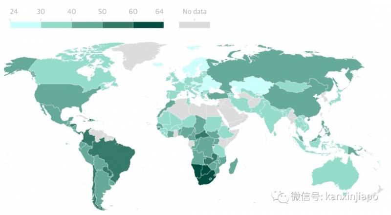 (2017年世界银行基尼系数地图。基尼系数越小收入分配越平均,基尼系数越大收入分配越不平均。从低到高,颜色从浅绿到深绿。最深色的地方是贫富差距最大的地方。)