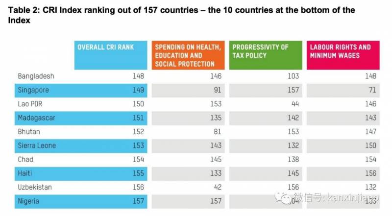 但今天,在国际慈善组织乐施会(Oxfam)最新发布的“2018承诺减少不平等指数”(Commitment to Reducing Inequality Index)中,新加坡在157个国家中,排149,倒数第八名!