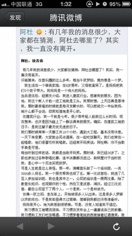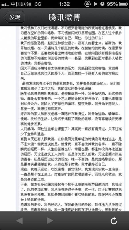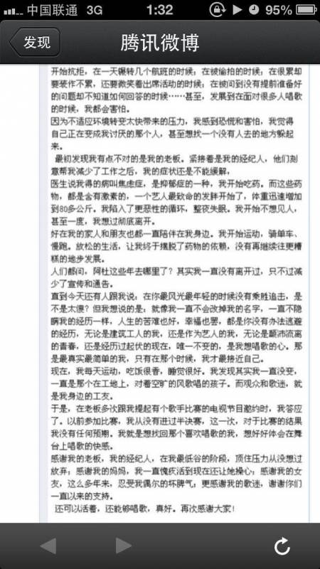 此后的阿杜依旧在出专辑,但是专辑质量呈逐年下滑的趋势,准确说不是严重下滑,而是后面的专辑无法回到第一张的高度,甚至连个边儿都摸不到。这直接导致阿杜人气下滑,因为他不是像范冰冰那样靠话题炒作的明星,他是一个无心插柳柳成荫的草根实力派歌手,一大把年纪了,人也蛮憨厚低调的,你让这样的人去吵绯闻纯属搞笑,这个年纪跟谁炒?谁愿意跟他炒?面对人气不断下滑的状况,阿杜也曾在微博上解释过: