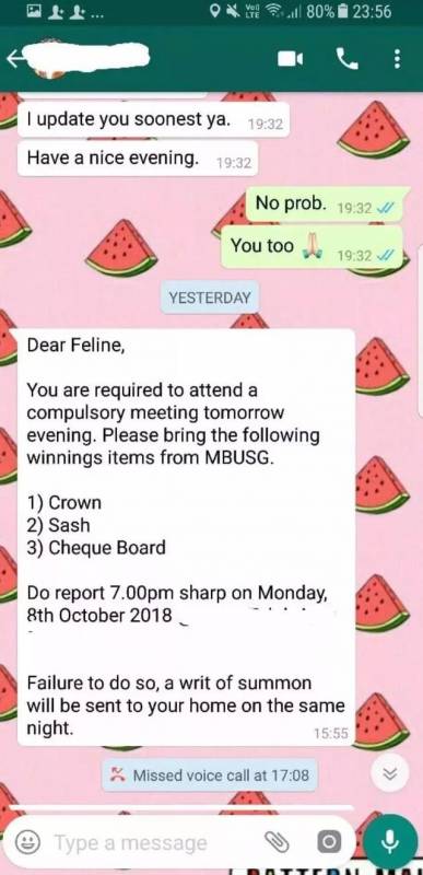 现如今Feline Wong 不但被要求归还后冠,礼仪带以及支票,主办方还表示若不归还,将对Feline Wong采取法律行动!