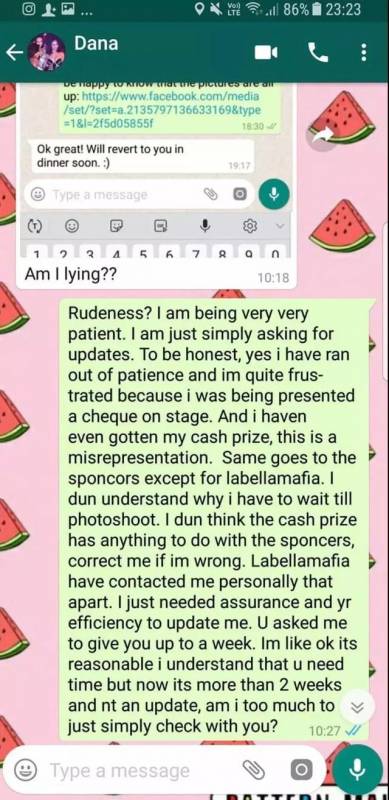 相信大家看到这里都会觉得 “WHAT??” Feline Wong本人的反应和大家一样,觉得莫名其妙。她表示自己并没有“粗鲁”,从两人的聊天记录也看得出来 Feline 只是在询问有关于奖品发放的细节。