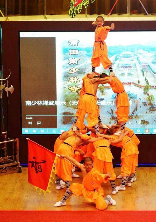 活动中,南少林寺武僧团的精彩表演,给观众留下深刻的印象。86岁的大会主持人张铭恩老师傅盛赞武僧团的表演系统完整,精气神十足,是中华武术的优秀代表之一。 (延巴 毓骏)