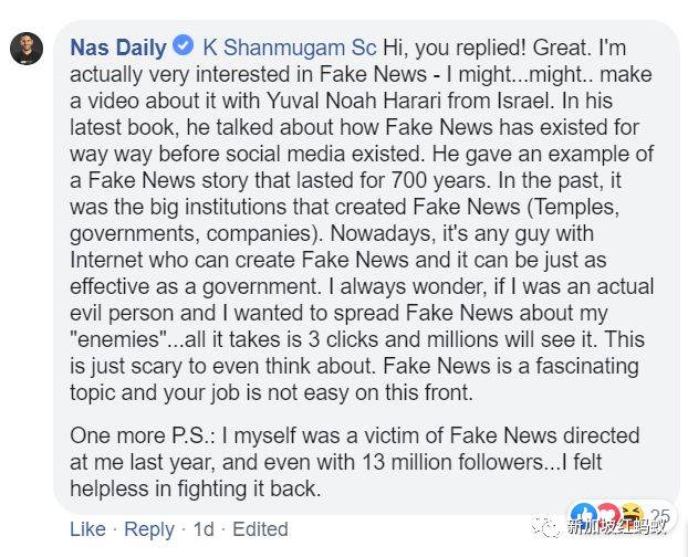 部长的帖文发出后,很快就引起刚在4月中旬将新加坡当成第二个家的国际网红Nas Daily的注意。他在部长的帖文下留言说: