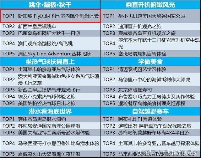在众多“跳伞·蹦极·秋千”类的游乐项目中,本地的“iFly风洞飞行室内跳伞”完胜新西兰的“皇后镇跳伞”和峇厘岛“乌布网红大秋千一日游”,成为了中国游客最爱的冒险类游戏。排名前五的游乐项目为游客带来别具一格的感官刺激,赢得了中国人的青睐。毕竟,中国游客已经告别了买买买的土豪式旅游方式。