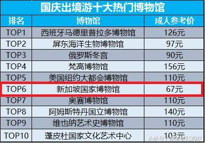 据携程公布的数据显示,在国庆出境游十大热门博物馆中,新加坡国家博物馆榜上有名,列位第六,甚至排在法国奥赛博物馆的前头。而且,在价格方面,它也比其他九个来得低。西班牙马德里普拉多博物馆成为最受中国游客欢迎的博物馆,紧随其后的是台湾屏东海洋生物博物馆以及俄罗斯冬宫。