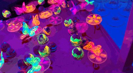 就连现场的小食和鸡尾酒都准备特别用心。看到这忽闪忽闪的蝴蝶和花朵了吗?竟然是用可食用萤光色彩描绘的巧克力~