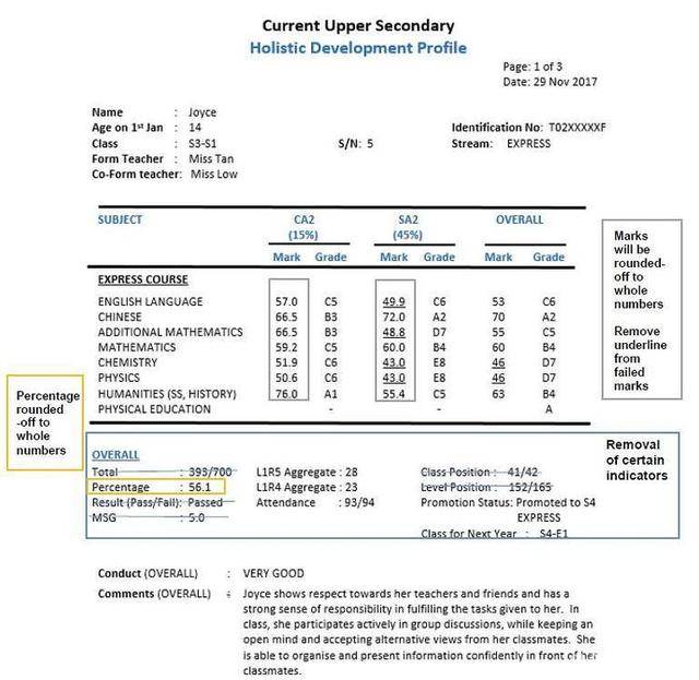 一张中学成绩单样本以及即将做出的改动。来源于MOE