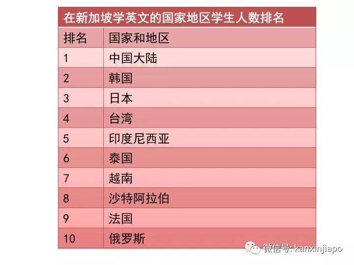 中国大陆来新加坡学英语的人最多,其次是韩国、日本。大部分学生都来自亚洲,因为新加坡是亚洲少数以英文为工作、学习、生活中主要用语的国家。