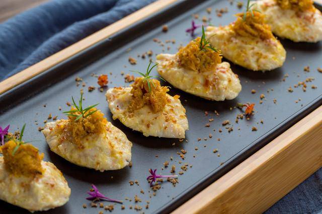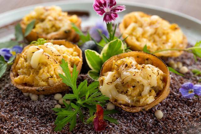 白玉蟹粉蛋挞是西安香格里拉大酒店中餐行政总 厨张志华师傅的精选菜品。此款菜肴灵感来源于 古语“秋菊”——“菊花开,闻蟹来”,张师傅 用秋菊盛开的模样来创作菜品。在菜品装饰方面 借鉴西餐摆盘的精致,在食材选择方面精选应季 食材大闸蟹的蟹粉。将蟹粉加入芝士、黄油搭配,既体现肉质腴美细嫩,又有脂膏丰满肥厚之感,回味还有蟹黄的浓香。此菜品入口绵软细腻, 有蛋挞的奶香与酥脆,张师傅对火候的拿捏十分精准,使两种口味层次分明。