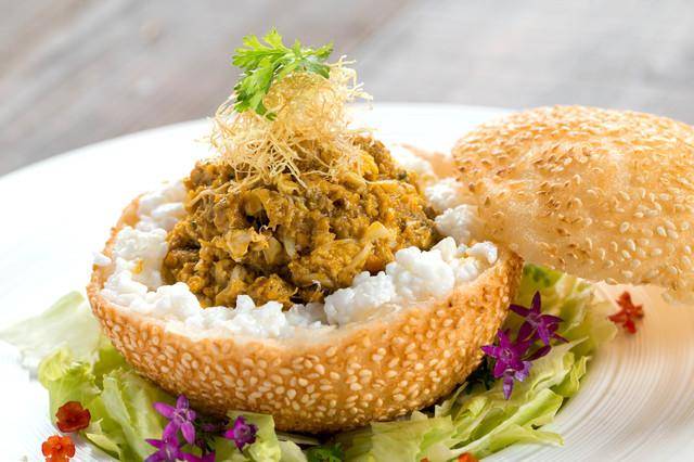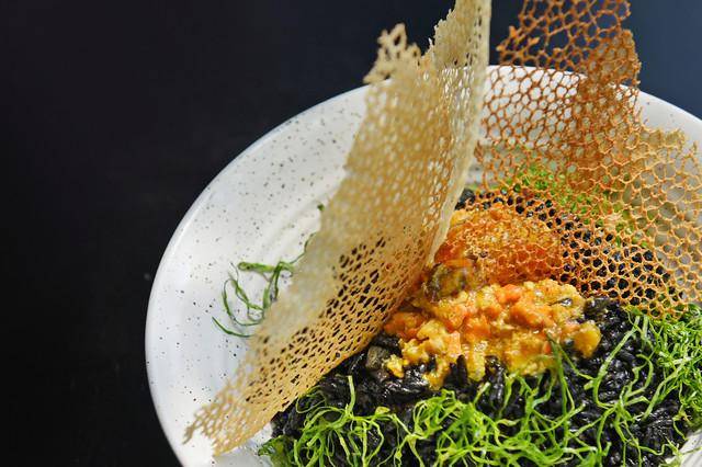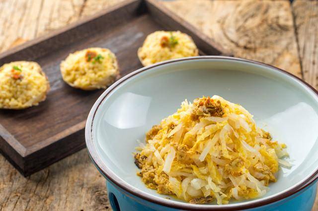 深圳福田香格里拉大酒店中餐行政总厨董玉振师傅特别创作这款秃黄油拌什锦墨鱼饭。传统珍馐秃黄油,以新疆博湖中华螯蟹的蟹膏蟹黄秘制而成,创意性的融合了墨鱼饭,配以秋意时节山珍、鲜肥带子、滋补牛肝菌以及清爽马蹄,呈现令人垂涎的新派江南风味。